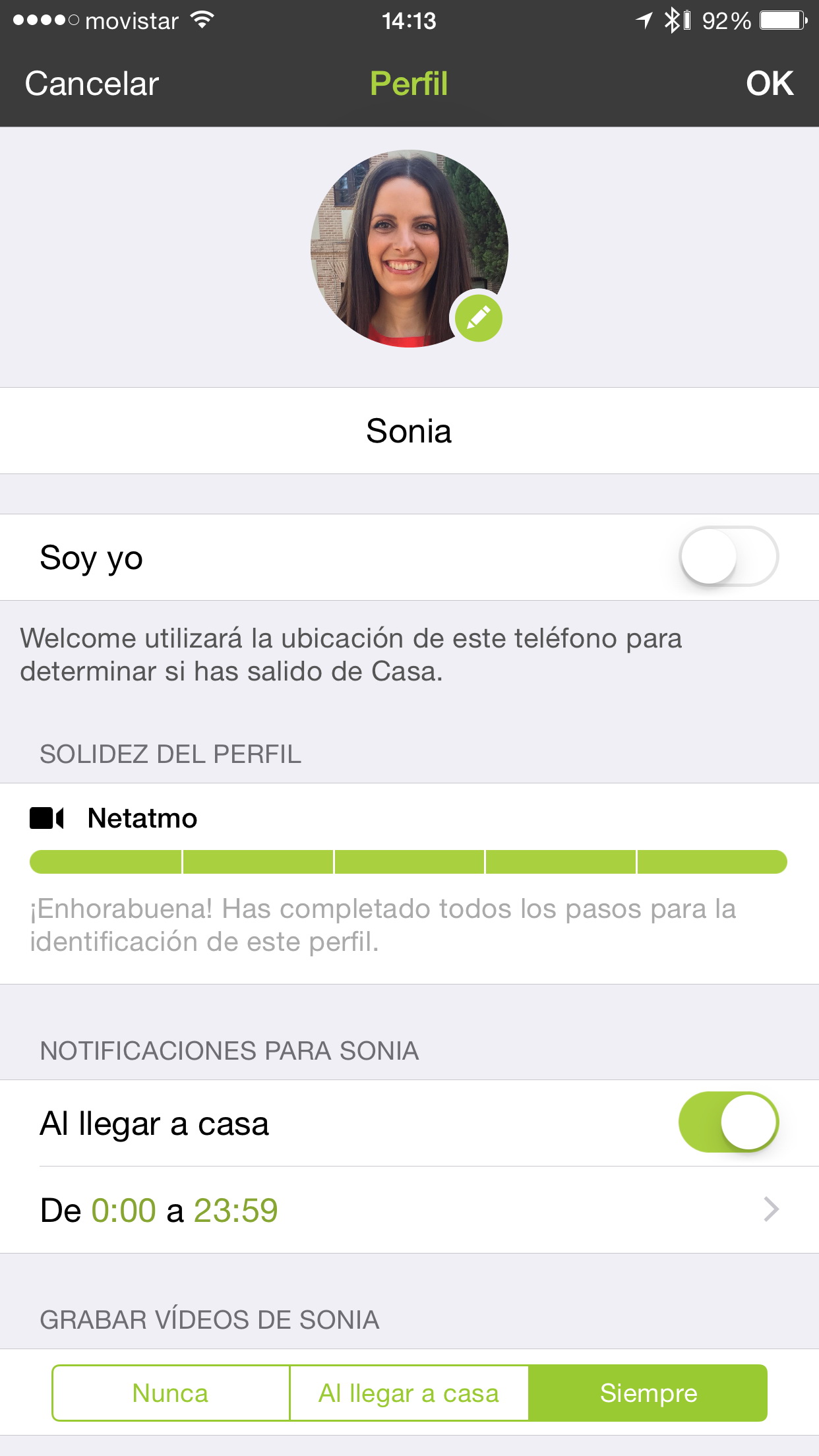 Para cada perfil puedes personalizar las notificaciones que recibirás en el móvil. Es posible especificar si se quiere recibir una notificación cuando esa persona llegue a casa y en qué horario debe ocurrir esto. También es posible especificar si se deben grabar vídeos de esa persona al llegar a casa, siempre que pase por delante de la cámara, o nunca.