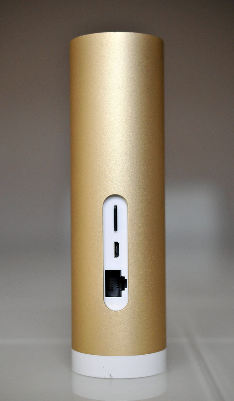 En medio del cilindro una banda de plástico negro recorre verticalmente su superficie. En la parte superior de esta banda encontramos el objetivo de la cámara, que sobresale ligeramente, y en la parte inferior está el micrófono.